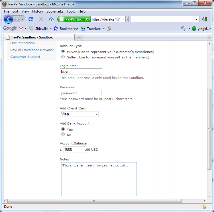 2. Click Create a preconfigured buyer or seller account to create a buyer account
