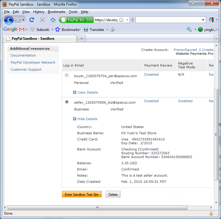 6. Select the seller account and click Enter Sandbox Test Site