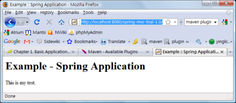 <head><title>Example :: Spring Application</title></head> <body> <h1>Example - Spring Application</h1> <p>This is my test.</p> </body>