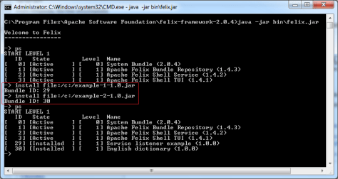 The above two OSGi bundles are based on the first two tutorials at Apache Felix Website. I will try the rest of the tutorials later.