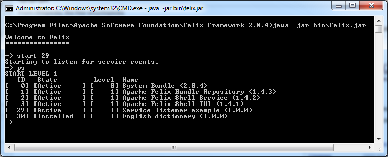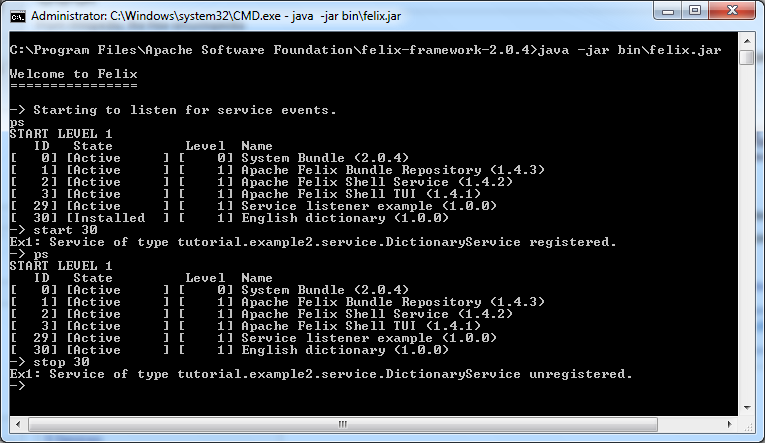 4. Now the Service listener example is registered. This service will echo a message whenever a new service is registered or unregistered. Let’s try it by starting and stopping the English dictionary service.