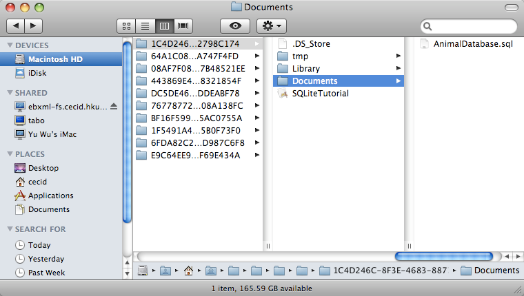 There would be many random named folder and you can distinguish the applications by looking into the files inside. The picture below shows the SQLite database AnimalDatabase.sql of application SQLiteTutorial.