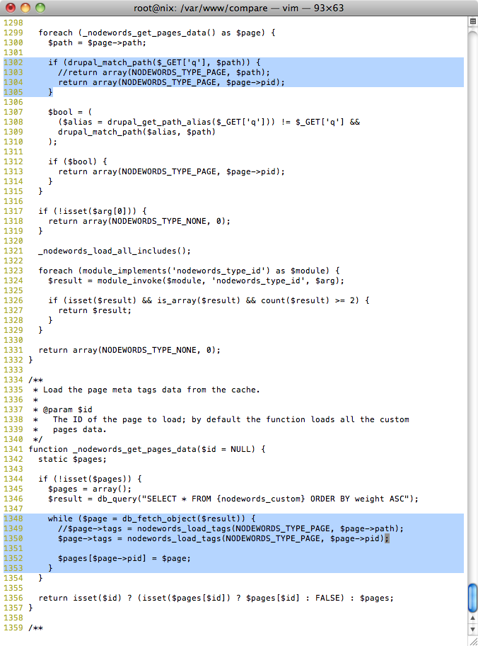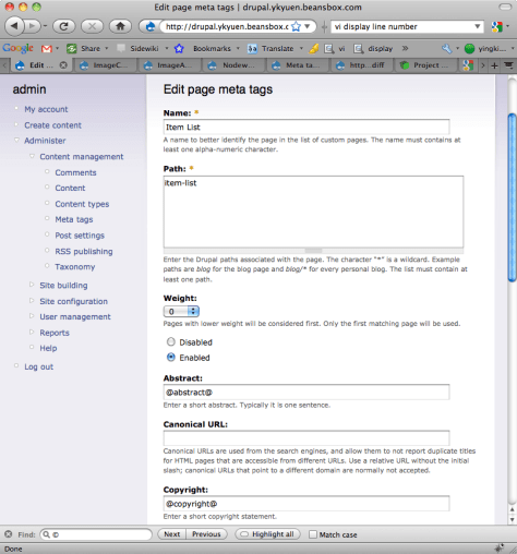 In this example, the Drupal version is 6.19 and the Nodewords module is 6.x-1.11. There is a bug in this Nodewords version and you can never save the meta tag for other page. Luckily, someone has created a patch and just edit the nodewords.module as follow.