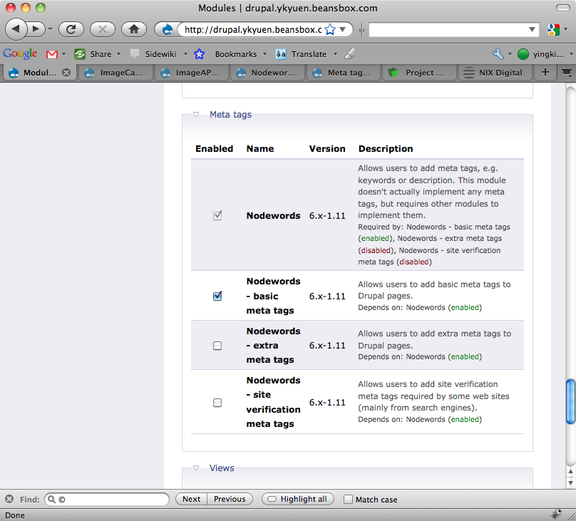 After downloaded and applied the patch for Nodewords module, enable the Nodewords and Nodewords – basic meta tags.