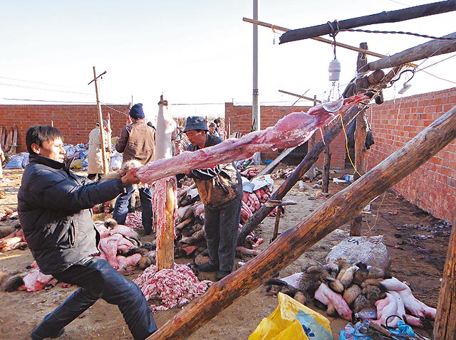人造地獄 – 工人把貉子掛到鐵勾上,然後從牠的後部從後監生扯下外皮,因皮與肉緊緊相連,工人大力一扯,發出「嘞嘞聲」。