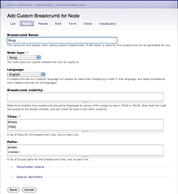 Go to @ Administer –> Site building –> Custom Breadcrumbs and add a new breadcrumbs for all Song nodes. i have added a middle breadcrumb called Artists which is linked to the <drupal_root>/artists path. and also add the node title at the breadcrumbs trail.