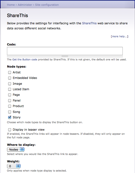 After you have downloaded and enabled the ShareThis module. You can configure its settings @ Administer –> Site configuration –> ShareThis.