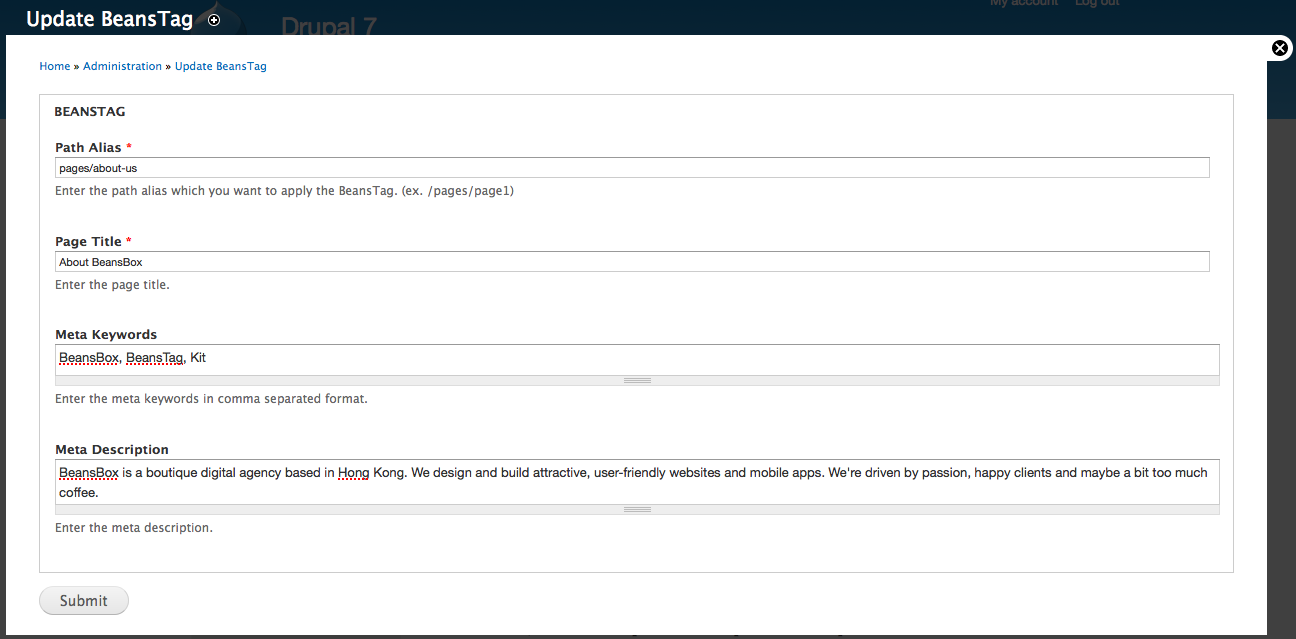 2. Browse the page which you want to manage the BeansTag and then click the Update BeansTag button. If the BeansTag for that path alias already exists, the current values if BeansTag will be loaded and you can update it with the prompted edit form. If no BeansTag is found, the current path alias is loaded and you can create a new BeansTag immediately.