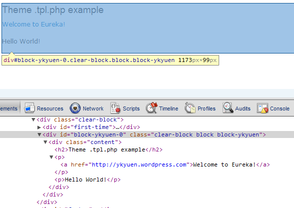 $block['content'] = theme('eureka', 'Welcome to Eureka!', 'https://ykyuen.wordpress.com');