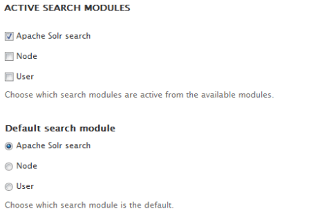11. Go to admin/config/search/settings and set the Apache Solr as default search module.