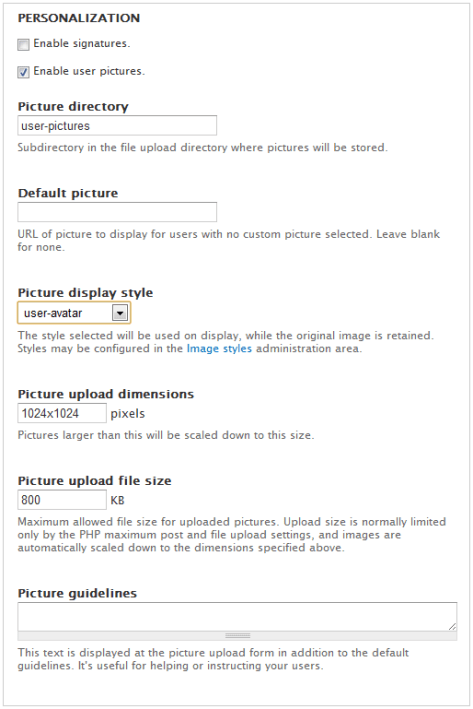 In the above setting page, you can define the profile picture size by selecting a proper Picture display style. In my case, the default image style is user-avatar.