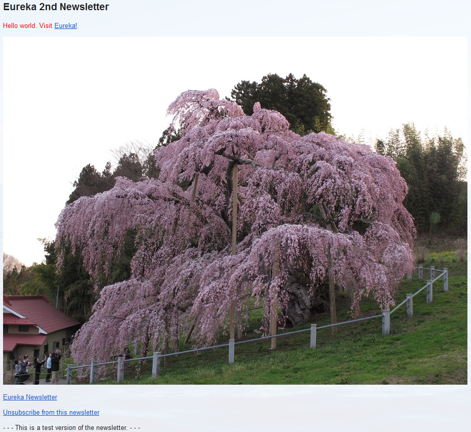 <h2>Eureka 2nd Newsletter</p> <p style="color: red;">Hello world. Visit <a href="http://eureka.ykyuen.info">Eureka!</a>.</p> <img src="https://eureka.ykyuen.info/wp-content/uploads/2012/02/img_1933.jpg"/>