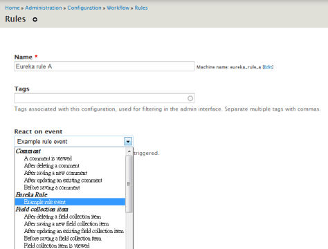 rules_invoke_event('example_rule_event', $user, $article, 'Hello Eureka!');