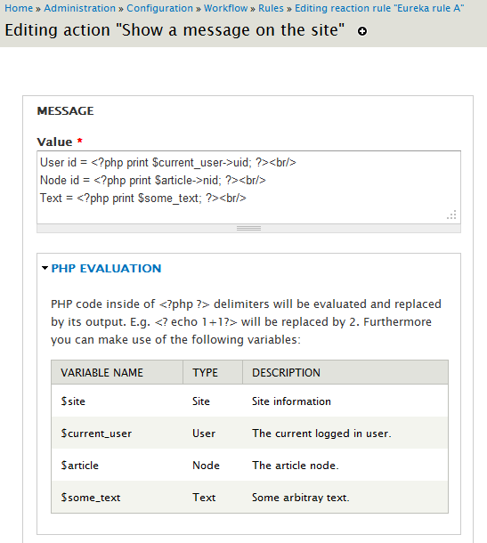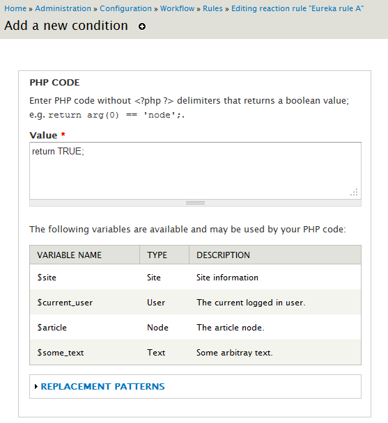 Add a new condition and select Execute custom PHP code. As you can see in the variable list($current_user, $article and $some_text), we could make use of those input parameters defined in the event. For simplicity, let’s always return TRUE.