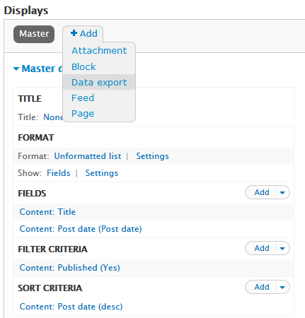 drupal7-view-data-export-2 May 17, 2013 431 × 450 Drupal 7 – Export view data CSV, XML, XLS by Views data export module Share this:Tweet Click to share on WhatsApp (Opens in new window) WhatsApp Click to share on Telegram (Opens in new window) Telegram More Click to print (Opens in new window) Print Click to email a link to a friend (Opens in new window) Email Share on TumblrPocket Click to share on Reddit (Opens in new window) Reddit Like Loading...