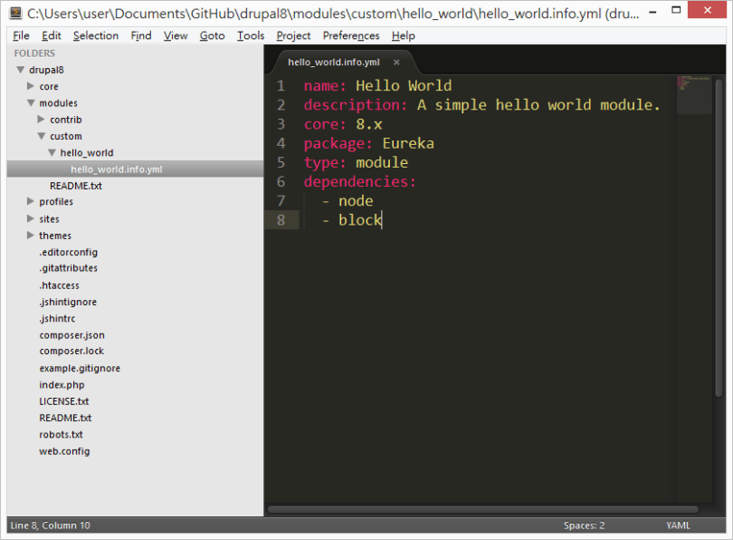 drupal-8-symfony-custom-hello-world-module-2 August 10, 2013 840 × 619 Drupal 8 – Create a Hello World custom module in Symfony framework Share this:Tweet Click to share on WhatsApp (Opens in new window) WhatsApp Click to share on Telegram (Opens in new window) Telegram More Click to print (Opens in new window) Print Click to email a link to a friend (Opens in new window) Email Share on TumblrPocket Click to share on Reddit (Opens in new window) Reddit Like Loading...