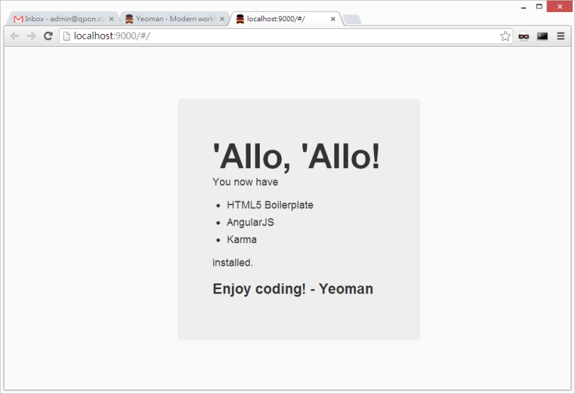angular-on-yeoman-2 September 8, 2013 996 × 684 Build an AngularJS webapp using Yeoman Share this:Tweet Click to share on WhatsApp (Opens in new window) WhatsApp Click to share on Telegram (Opens in new window) Telegram More Click to print (Opens in new window) Print Click to email a link to a friend (Opens in new window) Email Share on TumblrPocket Click to share on Reddit (Opens in new window) Reddit Like Loading...