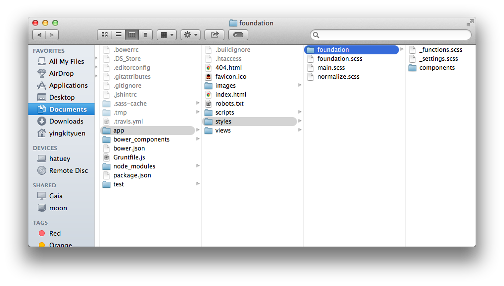9. The .scss files would be compiled to .css by the grunt command. Let’s include them in ./ng-foundation/app/index.html.