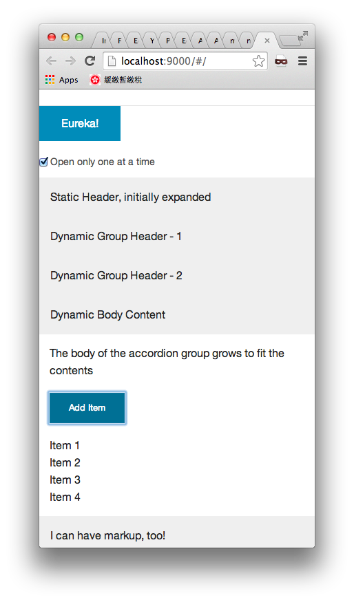 4. Let’s try to add the Foundation accordion. Edit the ./ng-foundation/app/views/main.html as follow.