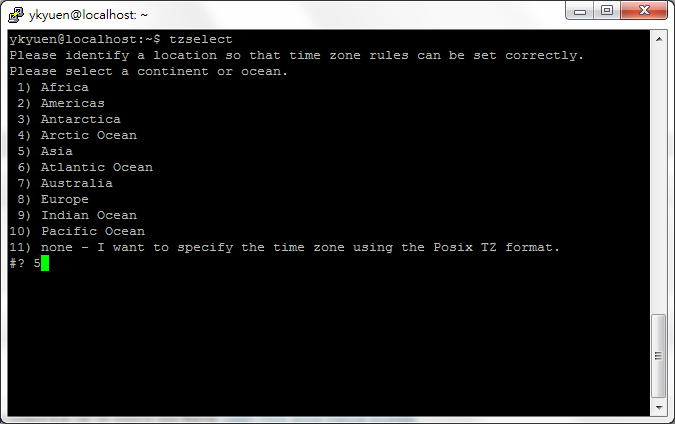 1. Run the tzselect command and select the continent or ocean.